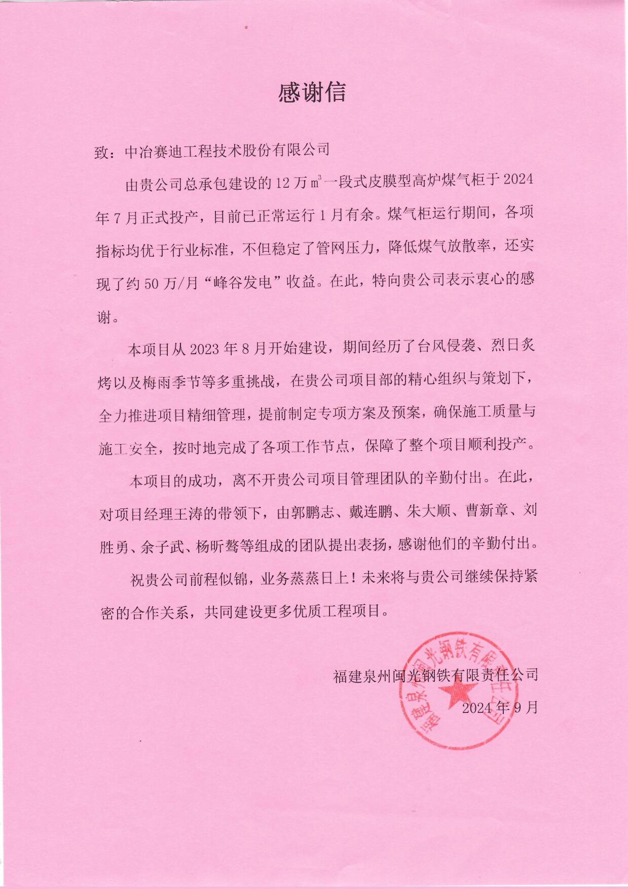 9月12日,福建泉州闽光钢铁有限责任公司发来感谢信。