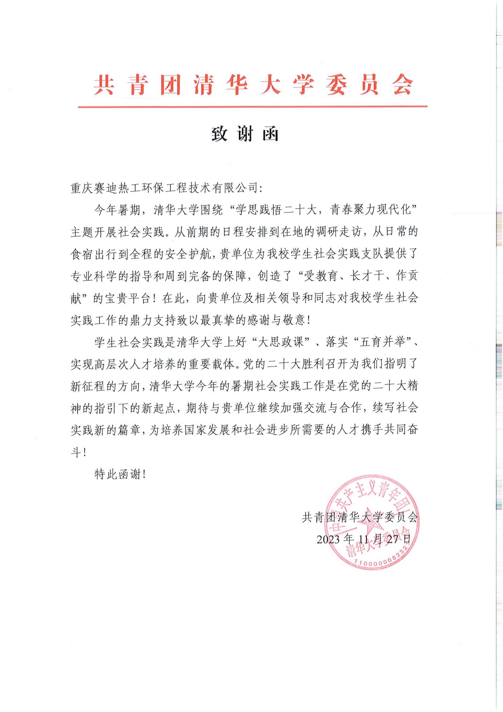 清华大学团委来函向赛迪热工环保公司 助力大学生社会实践致谢