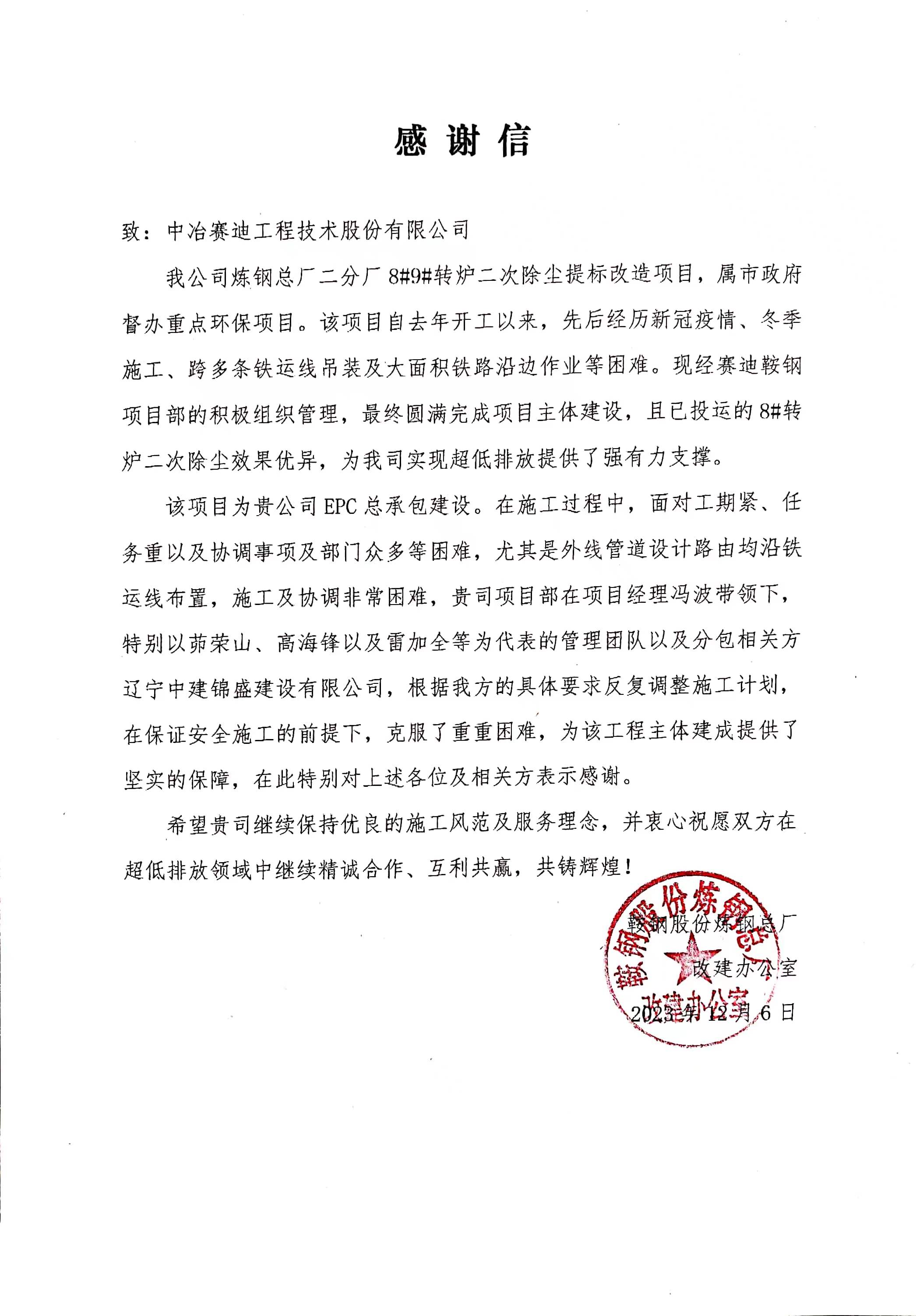 12月6日,鞍钢股份炼钢总厂改建办公室发来感谢信。信中表示该项目自2022年开工以来,先后经历新冠疫情、冬季施工、跨多条铁运线吊装及大面积铁路沿边作业等困难,经过赛迪鞍钢项目部的积极组织管理,最终圆满完成项目主体建设,已投运的8号转炉二次除尘效果优异,为鞍钢实现超低排放提供了强有力支撑。信中着重强调在面对工期紧、任务重以及协调事项及部门众多等困难下,尤其是外线管道设计路由均沿铁运线布置,施工及协调非常困难下,以冯波、茆荣山、高海峰为代表的项目团队根据鞍钢的具体要求反复调整施工计划,在保证安全施工的前提下,克服了重重困难,为该工程主体建成提供了坚实的保障。希望重庆赛迪热工环保继续保持优良的施工风范及服务理念,并衷心祝愿双方在超低排放领域中继续精诚合作、互利共赢,共铸辉煌!