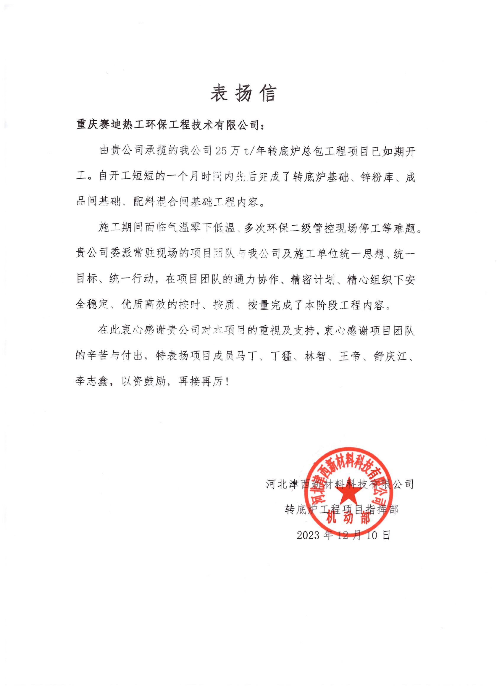 12月10日,河北津西新材料科技公司转底炉工程项目指挥部发来表扬信。信中提到重庆赛迪热工环保总承包的25万吨每年转底炉总包工程项目已如期开工,对开工后一个月时间内先后完成了转底炉基础、锌粉库、成品间基础、配料混合问基础工程内容的进度表示肯定。信中表示施工期间面临气温零下低温、多次环保二级管控现场停工等难题,马丁、丁猛、林智、王帝、舒庆江、李志鑫组成的项目团队与河北津西新材料科技公司及施工单位统一思想、统一目标、统一行动,在项目团队的通力协作、精密计划、精心组织下安全稳定、优质高效地按时、按质、按量完成阶段性工程内容。