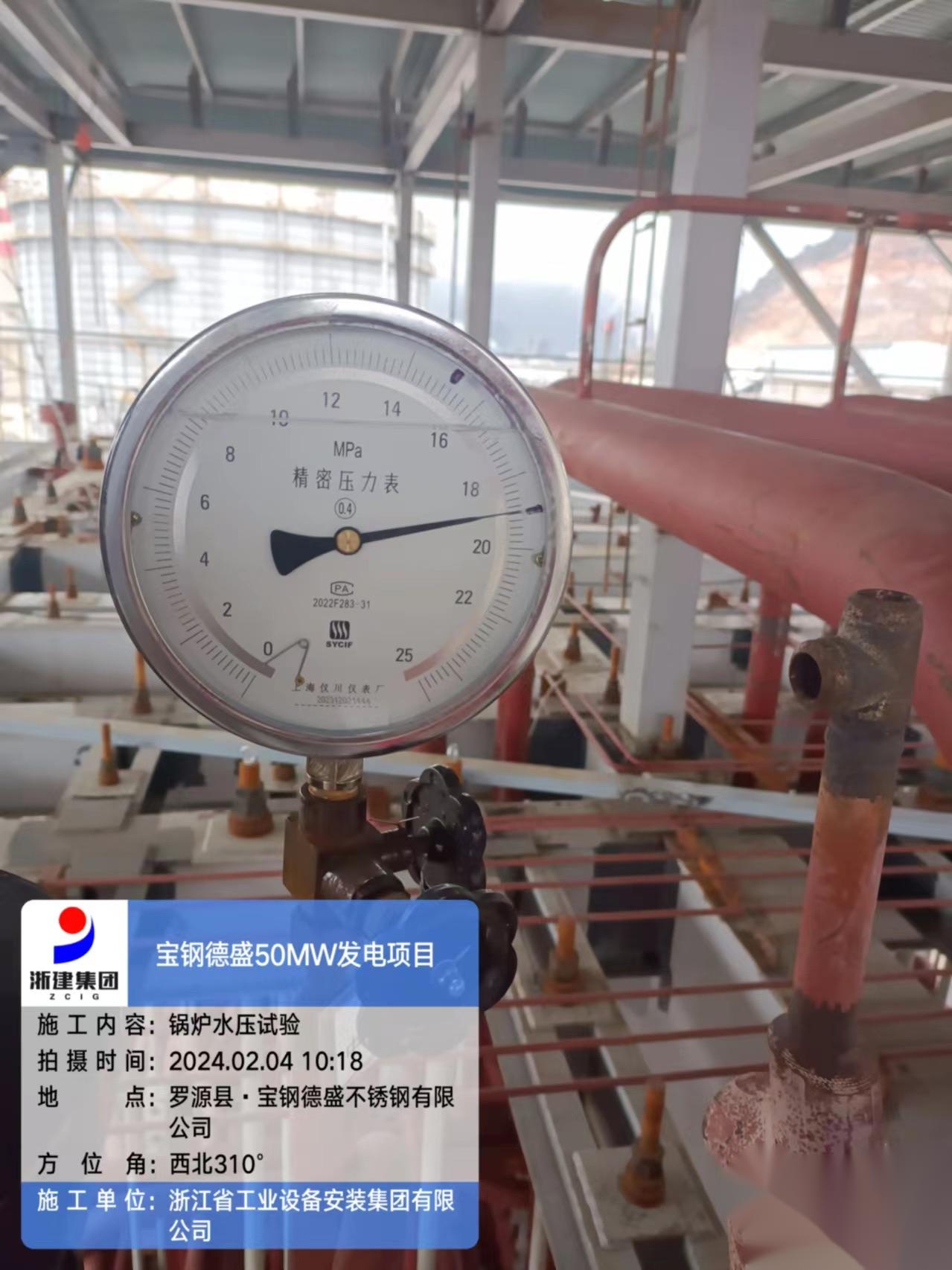 该项目包含1×170t/h超高温超高压煤气锅炉、1×50MW中间一次再热补汽凝汽式汽轮机、1×55MW发电机及配套辅助设施。项目建成后将大幅提高宝钢德盛副产煤气资源及蒸汽的综合利用效率,有效降低煤气及蒸汽放散,减少环境污染。本次试验对水冷壁、省煤器、过热器、再热器、集箱、本体管器等部件进行了压力测试,测试最高压力达18.88MPa。试验期间,集箱、密封面及管子等部件无破裂、无异常变形、无泄漏、无异常声响,锅炉各系统设备经试验合格。