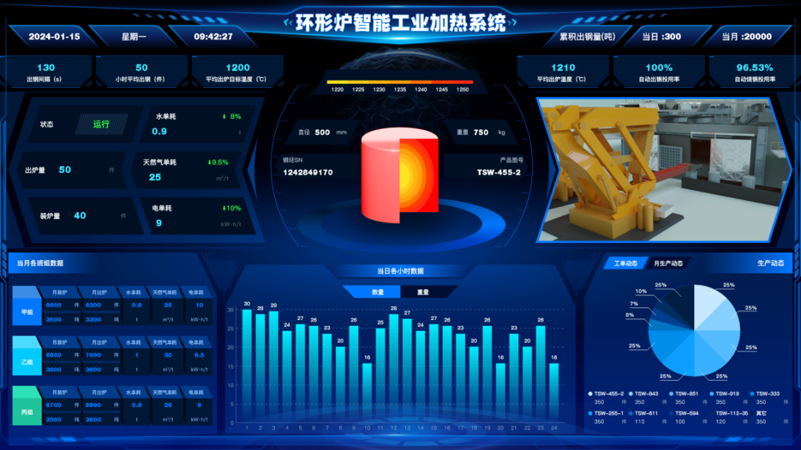 环形炉智能工业加热系统主要包含环形炉作业区的钢坯位置跟踪、运输链和入/出炉设备控制、钢坯在炉内的温度变化跟踪、环形加热炉的自动燃烧控制、环形炉作业区内关键设备运行状态跟踪等功能,可大幅提升环形加热炉作业区生产的自动化水平,提高钢坯加热质量和降低能耗水平。