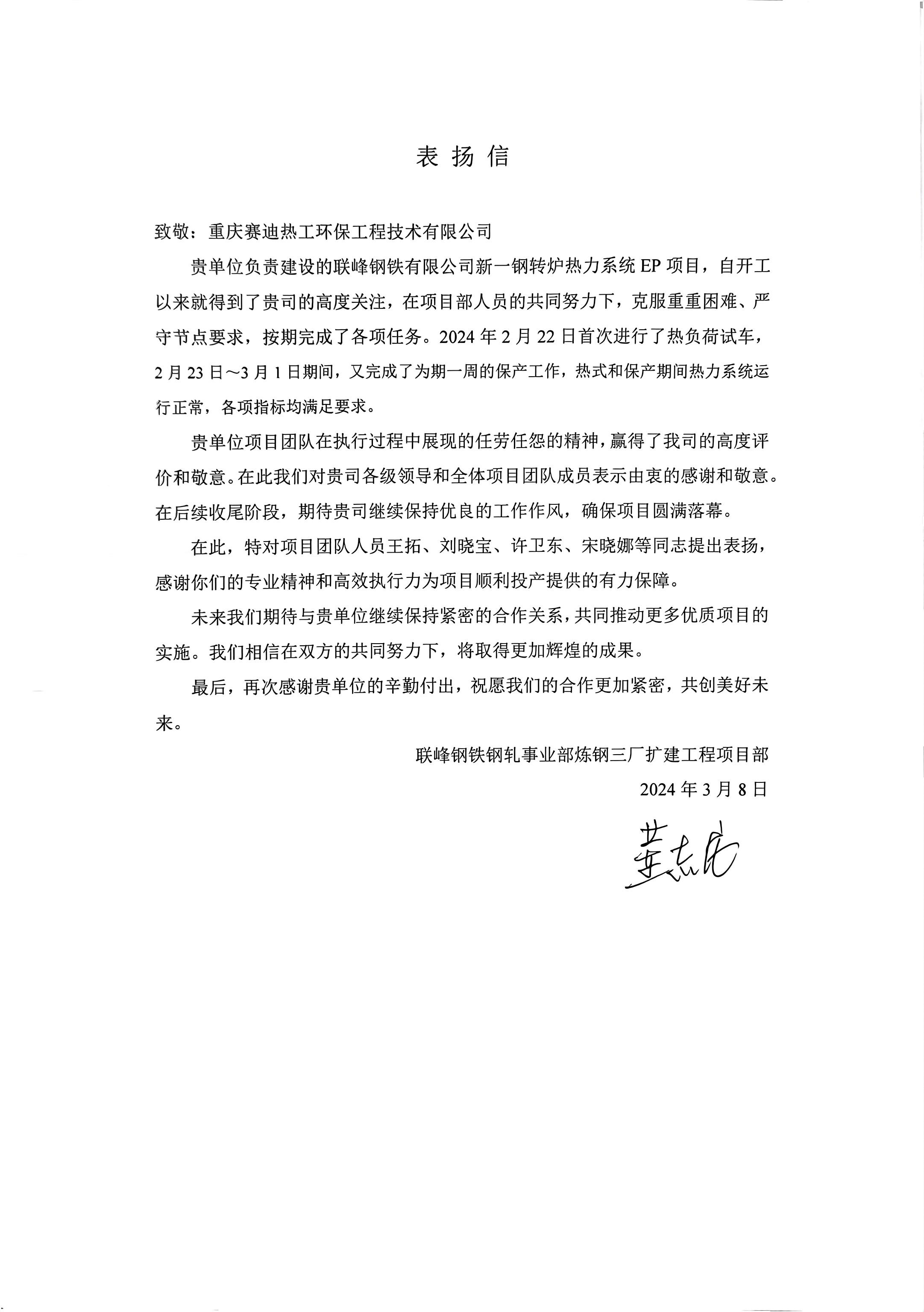信中表示由重庆赛迪热工环保承建的联峰钢铁有限公司新一钢转炉热力系统EP项目,于2月22日首次进行了热负荷试车,于2月23日至3月1日期间完成为期一周的保产工作,在项目部人员的共同努力下,克服诸多困难,按期完成了各项任务,热试和保产期间热力系统运行正常,各项指标均满足要求。