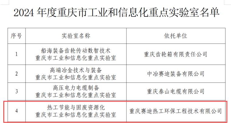 工信化重点实验室是重庆市工业和信息化领域技术创新的重要组成,是重庆市制造业创新体系的支撑力量。此次热工节能与固废资源化实验室被认定为重庆市工业和信息化重点实验室不仅是对重庆赛迪热工环保研发实力与创新能力的肯定,更是对重庆赛迪热工环保持续推进技术创新与科技成果转化的激励。
