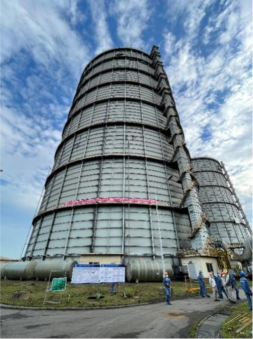 本次大修的高炉煤气柜为中冶赛迪自主研发的POC型煤气柜,容积为30万立方米,柜体总高约108米,是目前世界上容积最大的煤气柜,该煤气柜由中冶赛迪2015年总包承建,2016年投产运行,2022年进行检修,采用了圆筒形筒体与球拱型活塞,可大幅提高了储气压力与活塞平稳,同时还采用了橡胶条与稀油双重密封,可提高密封效果与密封寿命,具有稳定、长寿的特点,自建成投用以来,一直保持着良好的运行记录并经受过特大级台风考验。