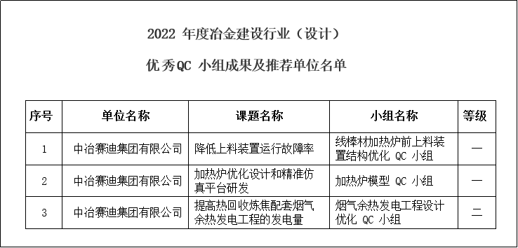 5月23日,中国冶金建设协会设计委员会公布了2022年度冶金建设行业优秀QC小组成果获奖情况,热工环保三项QC小组成果获奖。其中《降低上料装置运行故障率》《加热炉优化设计和精准仿真平台研发》两项QC成果荣获一等奖,《提高热回收炼焦配套烟气余热发电工程的发电量》QC成果荣获二等奖。