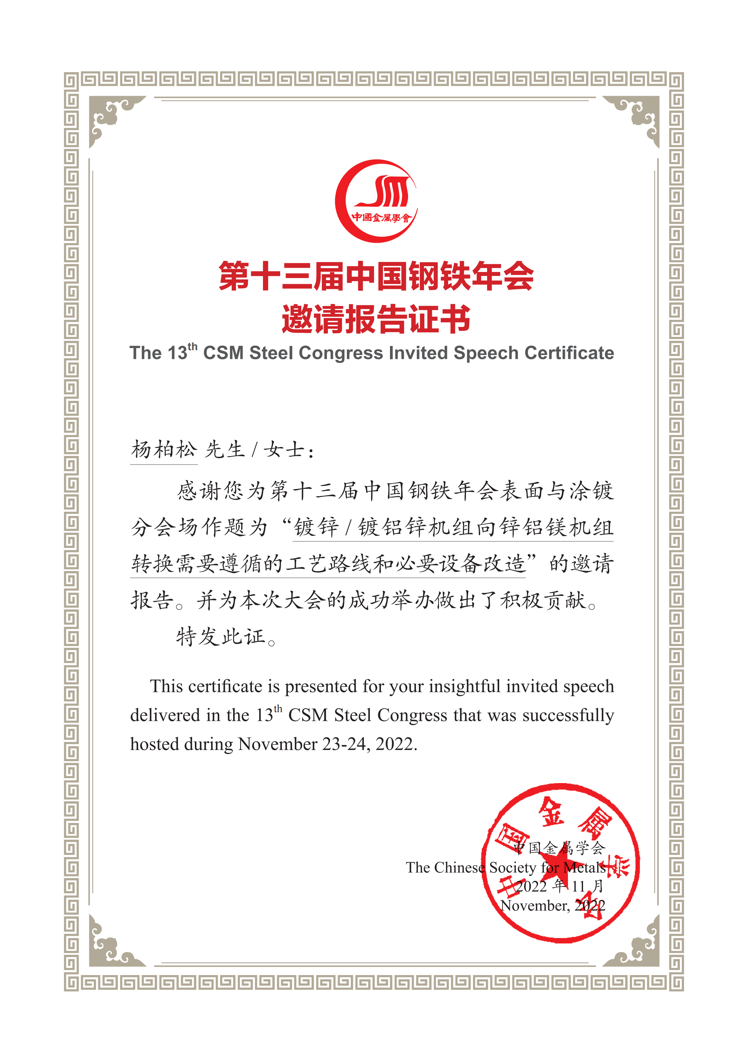 在2022年十三届中国钢铁年会上,重庆赛迪热工环保杨柏松专家应邀在表面与涂镀分会场作题为“镀锌/镀铝锌机组向锌铝镁机组转换需要遵循的工艺路线和必要设备改造”专题报告,展示了赛迪热工环保在在锌铝镁镀层的突出工艺技术和专有设备特点,对新建锌铝镁机组和现有镀锌机组向锌铝镁机组的改造提出了重庆赛迪热工环保的解决方案,受到广泛好评。