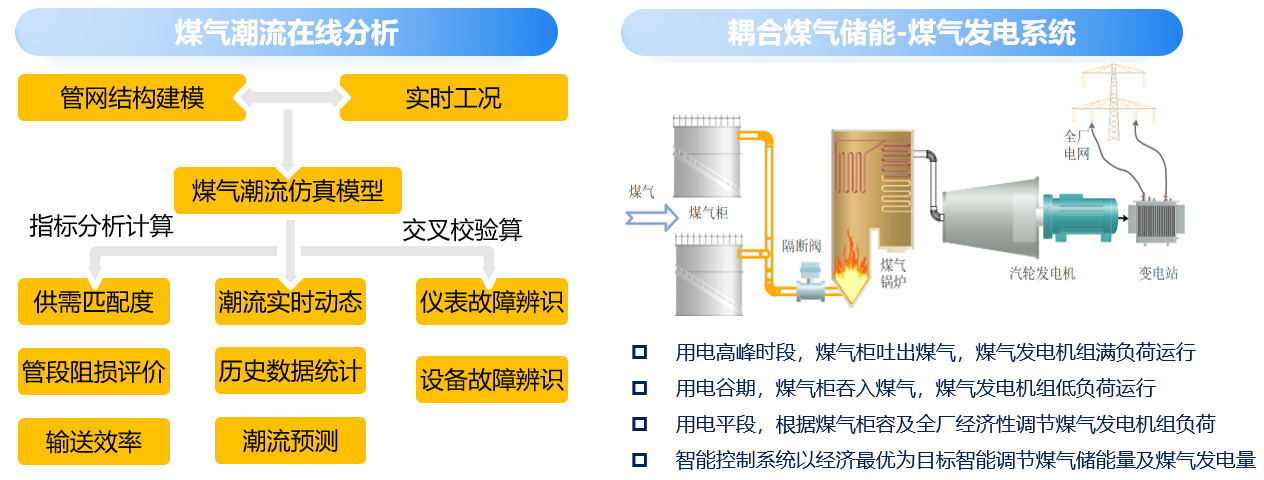 首创煤气潮流分析,在煤气柜与电厂之间建立煤气仿真流模型,预测管网实时参数,实现锅炉系统智慧燃烧;