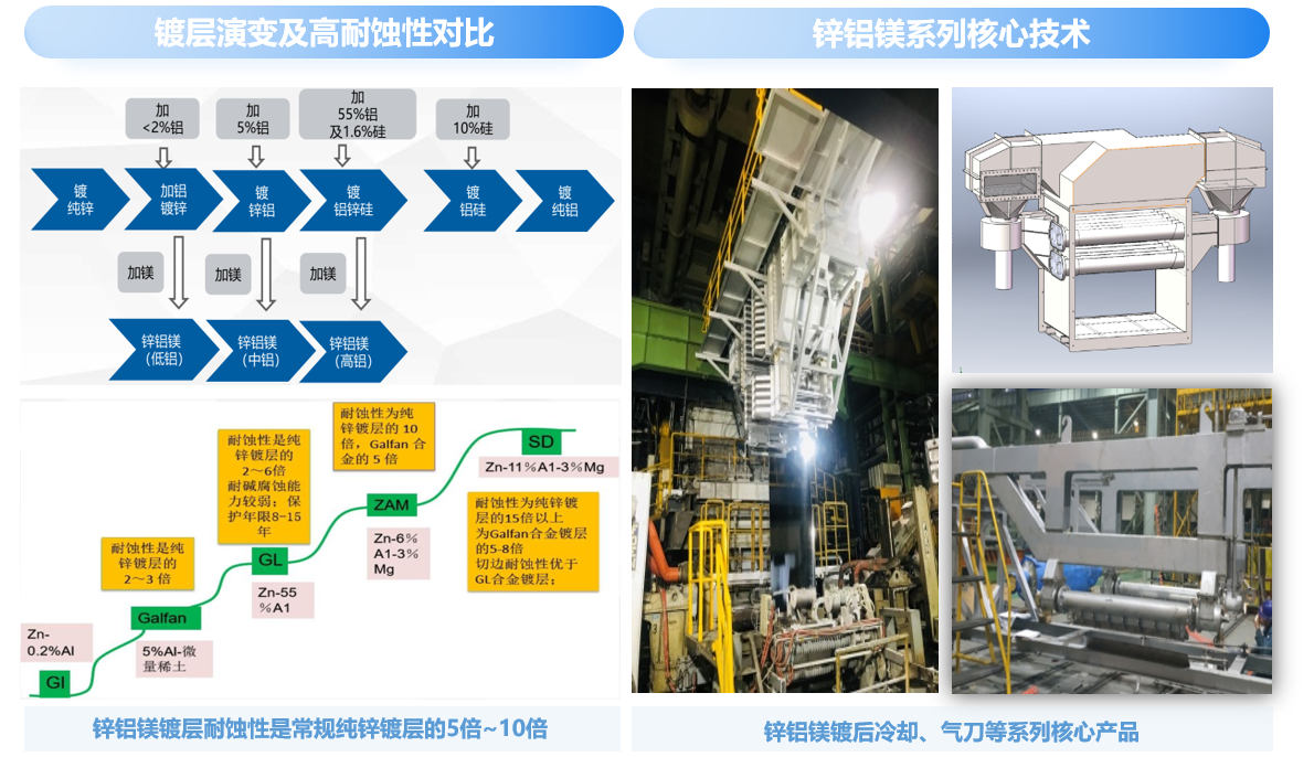 面向冷热轧后处理涂镀市场,在传统镀锌、镀铝锌技术基础上,开发了镀锌铝镁、镀铝硅等新型涂镀技术和装备,进一步提高钢材耐腐蚀性能,大幅提高钢材使用寿命,降低涂镀成本,实现涂镀产品全流程和全生命周期减碳。